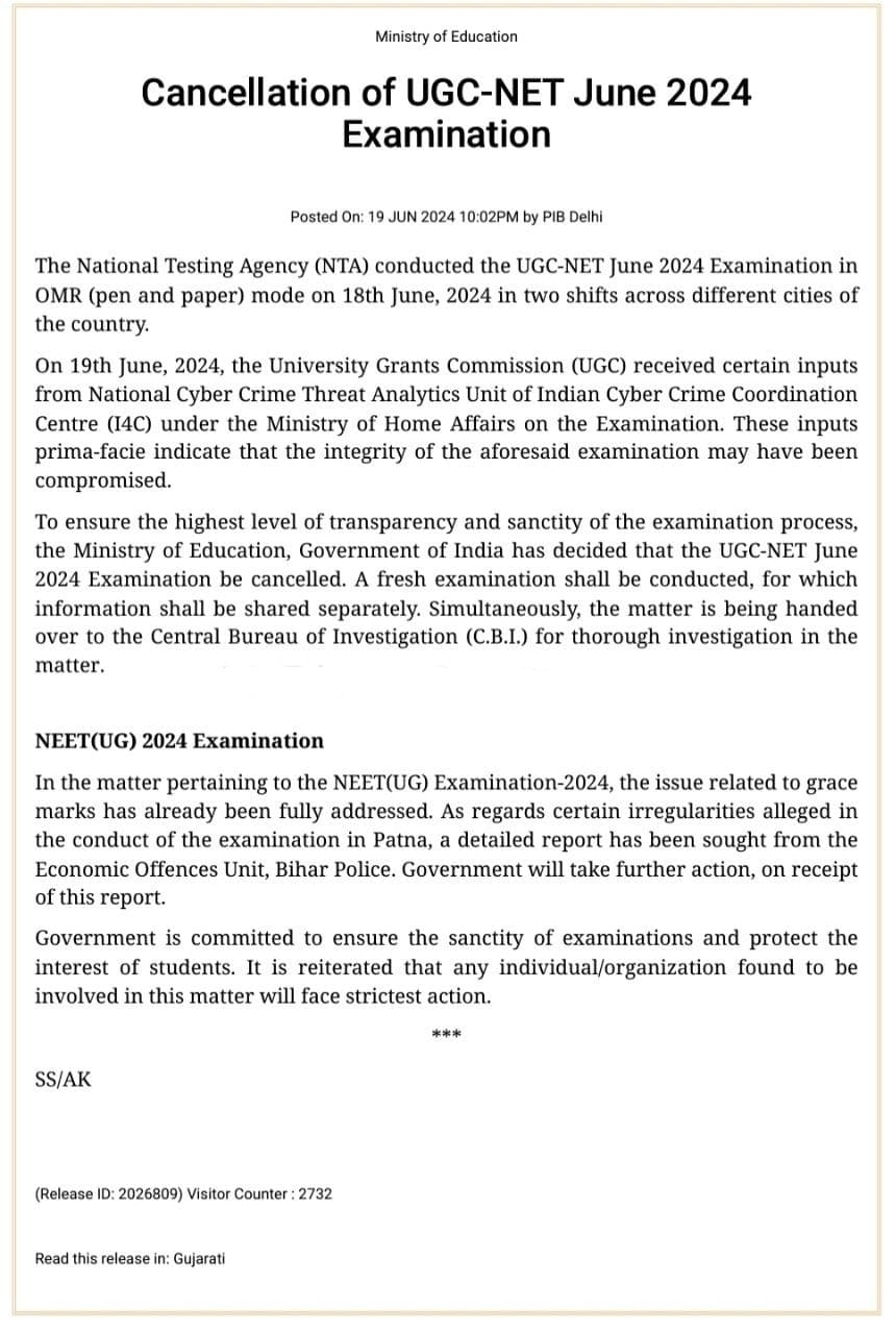 The Ministry of Education has cancelled the UGC NET June 2024 written exam due to a breach in exam integrity. A notice has been issued announcing the cancellation of the exam originally scheduled for June 18, 2024. The National Testing Agency (NTA) will announce a new exam date in the near future.